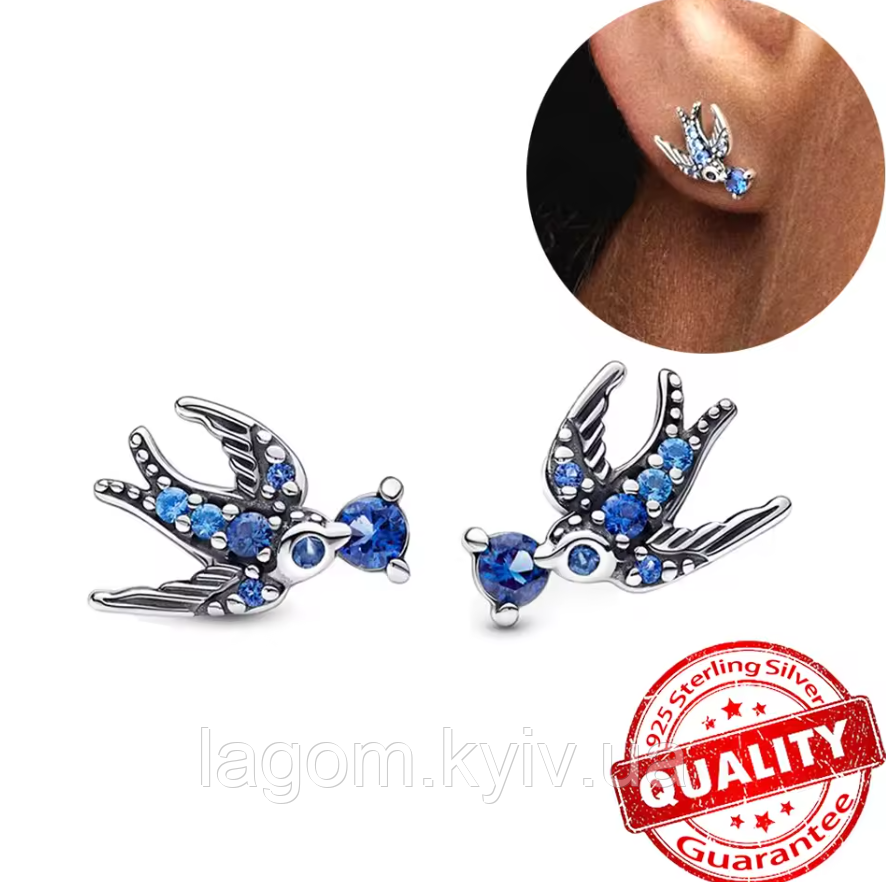 Сережки-гвоздики в стилі PANDORA "Blue Bird" Синій птах 925 проба кульчики-пусети ПАНДОРА